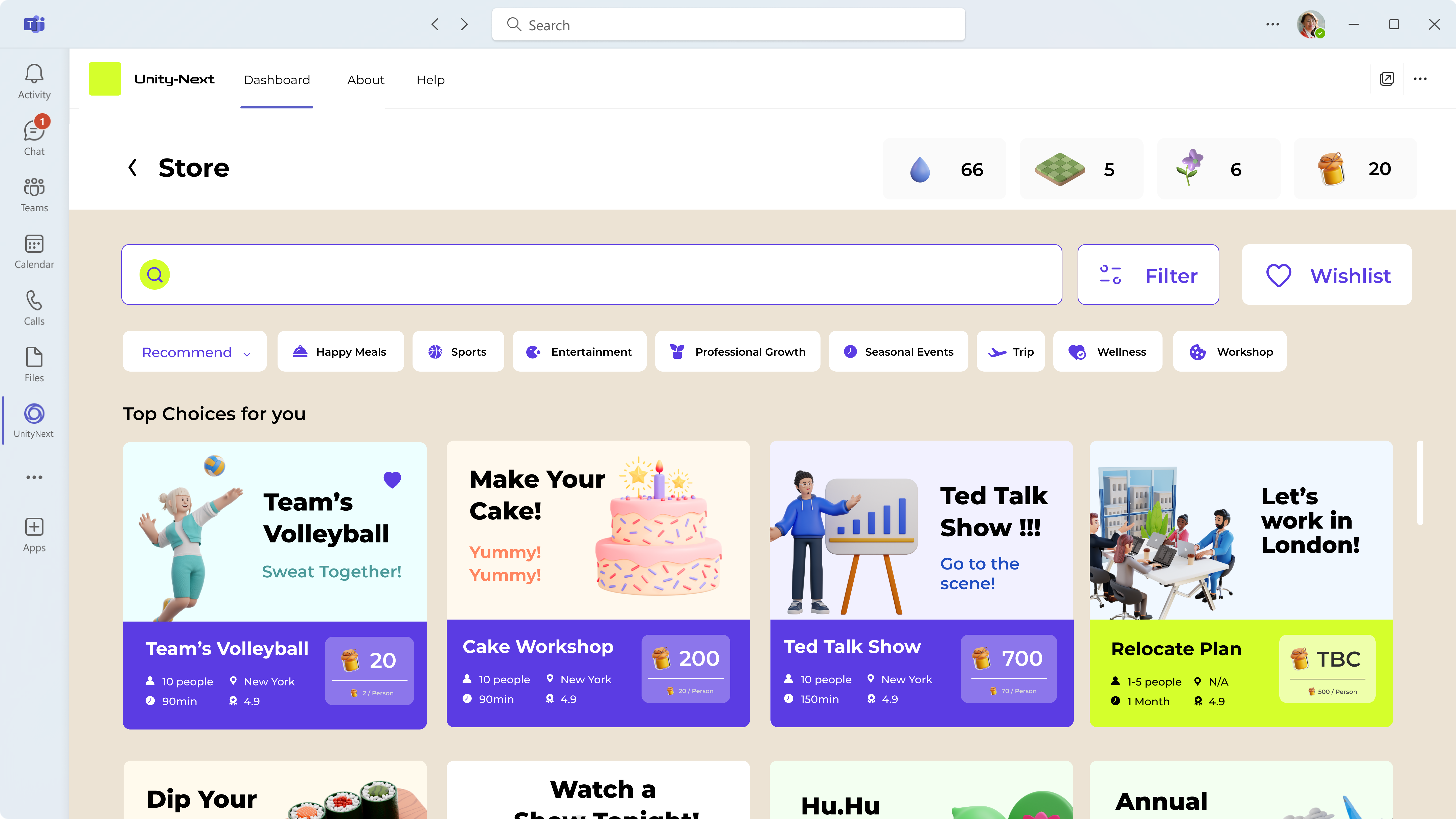 A virtual scenario embedded Microsoft Teams plugin for distributed colleagues to have continuous interaction as they grow themselves, contribute, and harvest in their flourishing company garden.